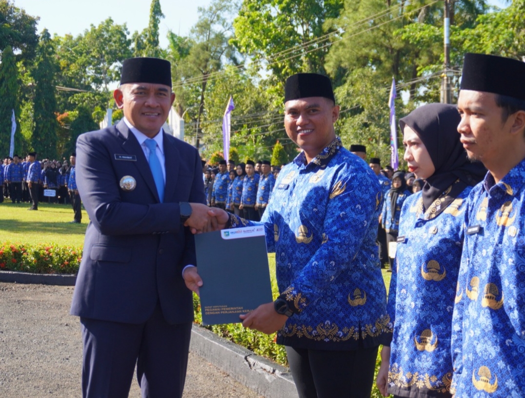 “Hari ini kami menyerahkan SK PPPK Paruh Waktu kepada 2.655 orang sebagai wujud komitmen pemerintah daerah untuk meningkatkan pelayanan publik. Saya berharap ini menjadi motivasi agar seluruh PPPK dapat bekerja lebih profesional dan berdedikasi dalam melayani masyarakat sesuai bidang tugasnya,” ujar Bupati Rahmat dengan nada tegas namun hangat.