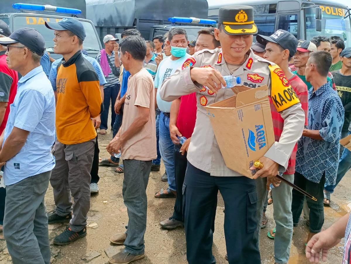 Tampak dengan humanis Kapolres menyapa massa pengunjuk rasa bahkan sempat membagikan minuman kepada massa pengunjuk rasa tersebut, hal ini dimaksudkan agar masyarakat memahami bahwa keberadaan kami (polri) ditempat aksi massa tersebut adalah semata-mata untuk memberikan rasa aman kepada semuanya, silahkan sampaikan aspirasinya yang memang telah diatur oleh undang-undang dengan tetap menjaga keamanan dan ketertiban. Ujarnya.