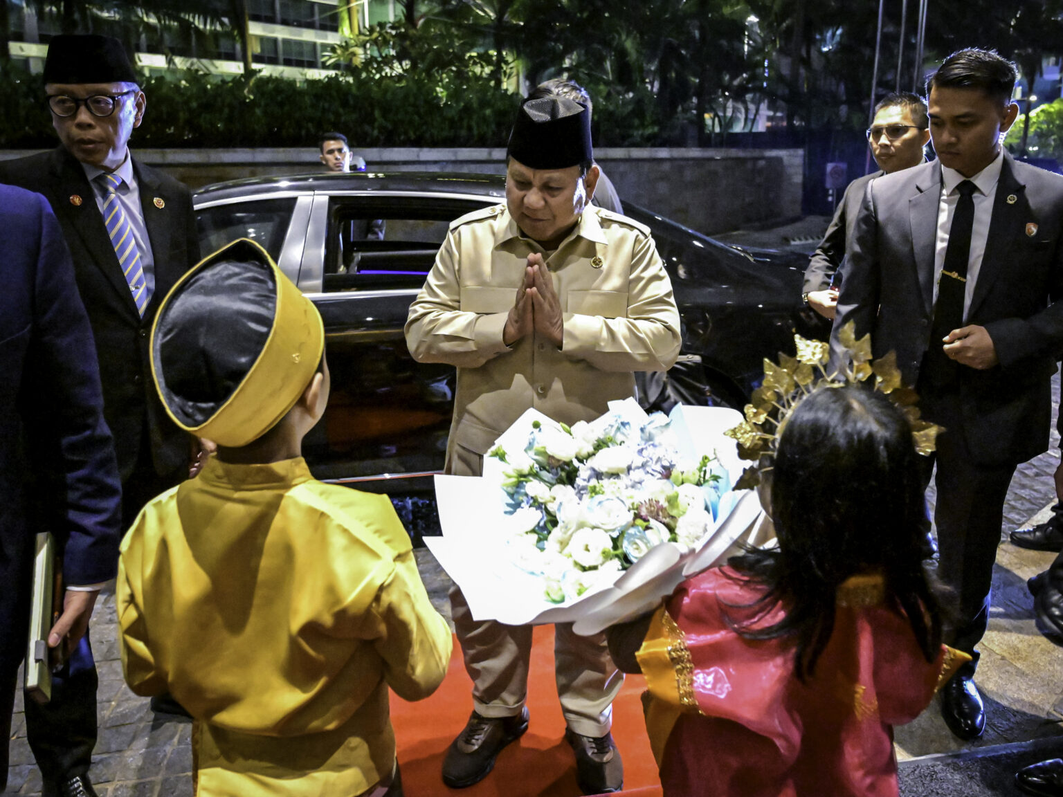 Setelah turun dari kendaraan, Presiden Prabowo langsung disambut oleh Wili dan Sahla, anak Indonesia yang bersekolah di Malaysia. Keduanya menyerahkan bunga tangan kepada Presiden Prabowo.