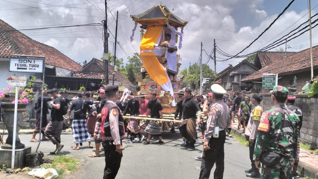 Adapun pelaksanaan upacara Ngaben tersebut untuk dua warga yang berpulang, yakni Almarhum Desak Ketut Kelepon dari Banjar Triwangsa Desa Tegal Tugu dan Almarhum Wayan Lasia dari Banjar Pratama Mandala Desa Tegal Tugu, setelah selesai dilangsungkan upacara adat dikediamannya masing masing selanjutnya Jenasah diarak oleh warga, kerabat dan pihak keluarga dengan menggunakan sarana Joli menuju tempat pemakaman dan upacara pembakaran jenazah dilaksanakan di Setra (Kuburan) Desa Adat Tegal Tugu.