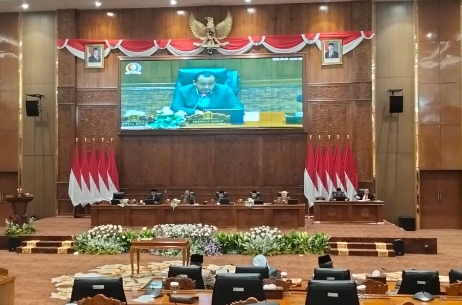 Ketua DPRD Bojonegoro Abdulloh Umar memimpin jalannya rapat paripurna didampingi Wakil Ketua I Sahudi dan Wakil Ketua II Bambang Sutriyono dan Wakil Ketua III Mitro’atin.