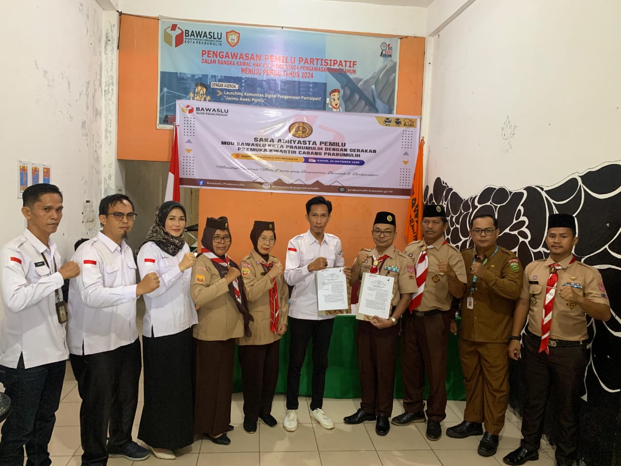 PRABUMULIH (SUMSEL) SUARAPANCASILA.ID – Badan Pengawas Pemilihan Umum (Bawaslu) Kota Prabumulih bersama Gerakan Pramuka Kwartir Cabang (Kwarcab) Kota Prabumulih menandatangani Memorandum of Understanding (MoU) pembentukan Satuan Karya (Saka) Adhyasta Pemilu, di ruang rapat Kantor Bawaslu Kota Prabumulih, Kamis (23/10/2025).