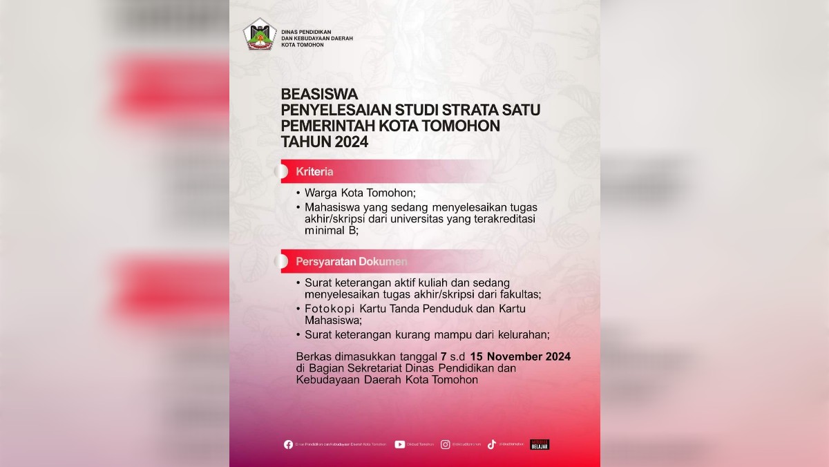 “Kriteria penerima yakni warga Kota Tomohon dan merupakan mahasiswa yang sedang menyelesaikan tugas akhir/skripsi dari universitas yang terakreditasi minimal B,” jelas Kepala Dinas Pendidikan dan Kebudayaan Kota Tomohon, DR Dolvin Karwur.