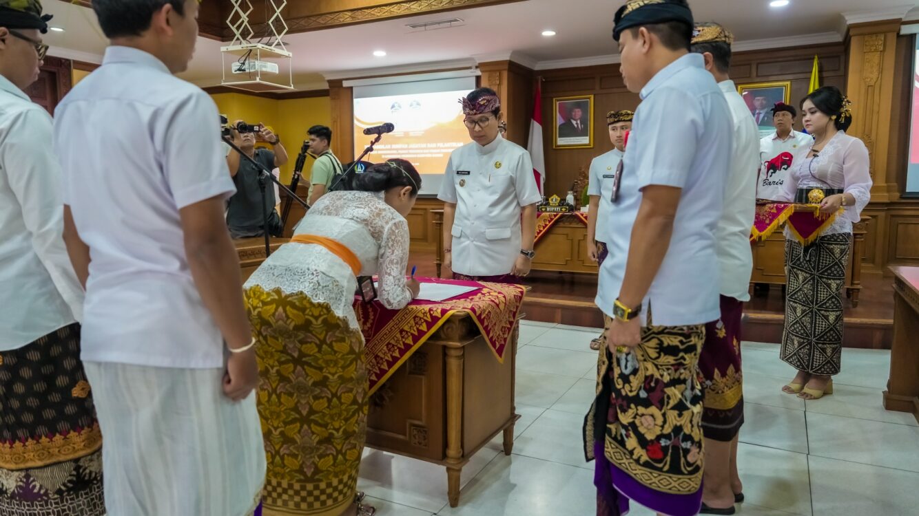 BADUNG,SUARAPANCASILA.id-Bupati Badung I Wayan Adi Arnawa melantik dan mengambil sumpah jabatan Pejabat Administrator, Pejabat Pengawas dan Pejabat Fungsional di lingkungan Pemkab Badung di ruang Kriya Gosana, Puspem Badung, Kamis (14/8). Sebanyak 61 pejabat dilantik, terdiri dari Pejabat Administrator dan Pejabat Pengawas sebanyak 18 orang dan Pejabat Fungsional 43 orang. Khusus pejabat administrator dan pengawas ditugaskan untuk mengisi jabatan di RSUD Giri Asih di Abiansemal dan RSUD Suwiti di Petang. Sebagai Direktur RS Giri Asih dipercayakan kepada dr. Ni Luh Ketut Ayu Ratnawati, M.Kes yang sebelumnya menjabat Kabid Pelayanan Kesehatan Dinas Kesehatan dan dr. I Ketut Sukerta yang sebelumnya sebagai Dokter Madya UPTD Puskesmas Petang II menjabat Direktur RSUD Suwiti.