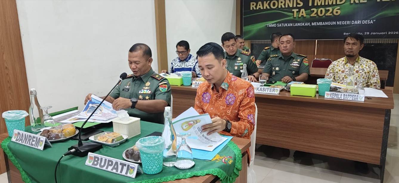 REJANG LEBONG (BENGKULU), SUARAPANCASILA.ID – Bupati Rejang Lebong H. M. Fikri Thobari, S.E., M.A.P bersama Ketua DPRD Juliansyah Yayan menghadiri dan mendampingi Komandan Korem(Danrem) 041/Garuda Emas (Gamas) Brigjen TNI Jatmiko Aryanto, S.E., M.Han. dalam kegiatan Rapat Koordinasi Teknis (Rakornis) TNI Manunggal Membangun Desa (TMMD) ke-127 TahunAnggaran 2026, yang digelar di Makorem 041/Gamas, Bengkulu, Kamis (29/1/2026), pukul 08.30WIB.