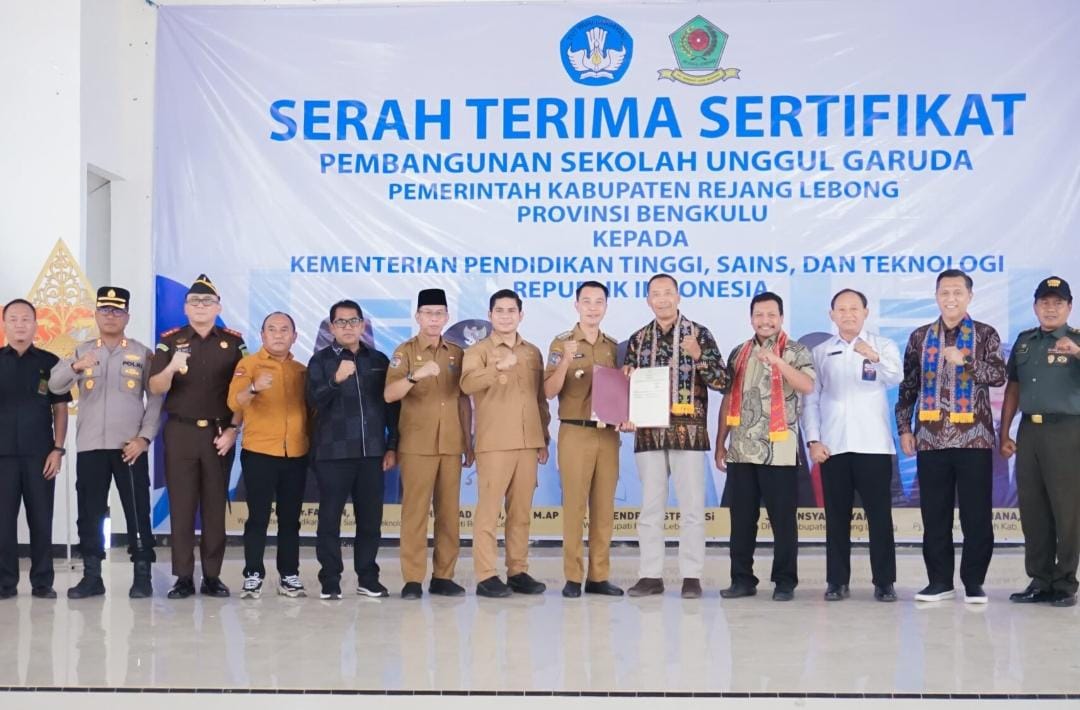 REJANG LEBONG (BENGKULU), SUARAPANCASILA.ID — Upaya Pemerintah Kabupaten (Pemkab) Rejang Lebong meningkatkan kualitas pendidikan memasuki tahap penting. Pada Selasa (2/12/2025), Bupati Rejang Lebong HM Fikri Thobari, SE., MAP., menyerahkan sertifikat lahan seluas 20 hektare kepada Wakil Menteri Pendidikan Tinggi (Dikti) Sains dan Teknologi, Prof. Dr. Fauzan, M.Pd.Lahan tersebut resmi dipersiapkan untuk pembangunan SMA Unggul Garuda. Prosesi berlangsung di gedung eks Balai Diklat BPKSDM Desa Mojorejo, Selupu Rejang, pukul 10.00WIB.