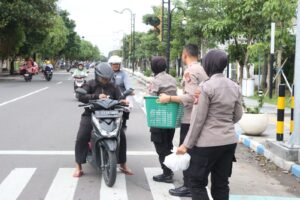 Polres Jombang Bagi Takjil Ke Pengendara Sembari Sosialisasikan Keselamatan Lalulintas
