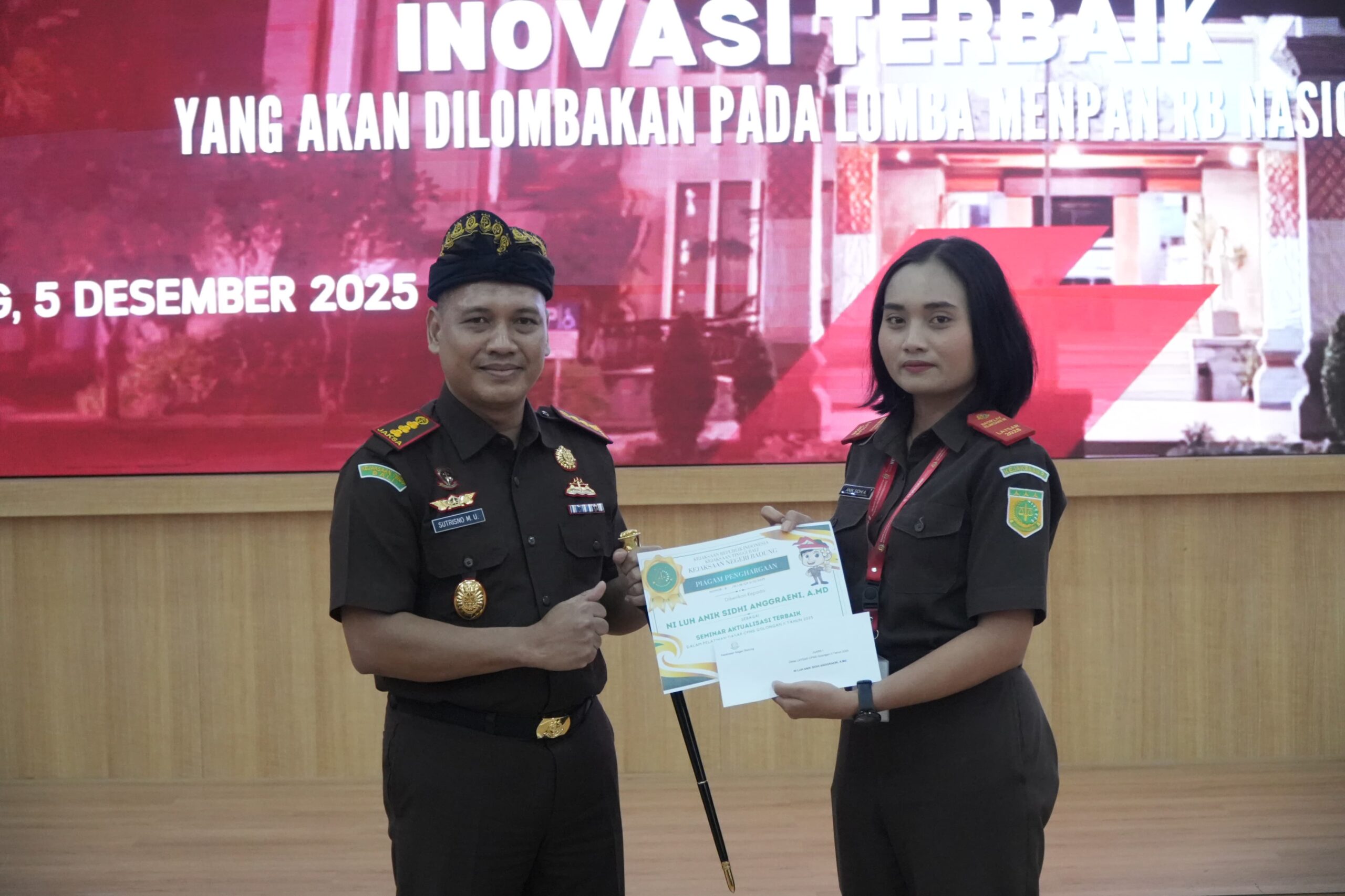 BADUNG,SUARAPANCASULA.id-Pada hari Jumat, 5 Desember 2025, bertempat di Aula Kejaksaan Negeri Badung, Kepala Kejaksaan Negeri Badung, Sutrisno Margi Utomo, S.H., M.H., memberikan piagam penghargaan kepada Ni Luh Anik Sidhi Anggraeni, A.Md.,CPNS pada Kejaksaan Negeri Badung, atas inovasi pelayanan Barang Bukti Online yang dikembangkannya dalam rangka aktualisasi pada Pelatihan Dasar (Latsar) CPNS Tahun 2025.