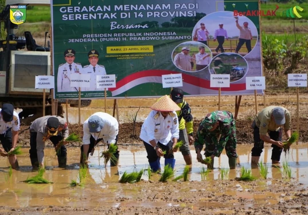 Pelaihari, Tanah Laut (KALSEL), SUARA PANCASILA.ID – Dalam sebuah langkah monumental yang menandai kebangkitan sektor pertanian nasional, Presiden Republik Indonesia Prabowo Subianto memimpin langsung gerakan tanam padi serentak di 14 provinsi, Rabu (23/04/2025). Berpusat di Sumatera Selatan sebagai lokasi utama, kegiatan ini terhubung secara virtual dengan daerah-daerah lain di seluruh Indonesia, termasuk Kabupaten Tanah Laut yang turut ambil bagian dari Lok Serapang, Kelurahan Pelaihari.