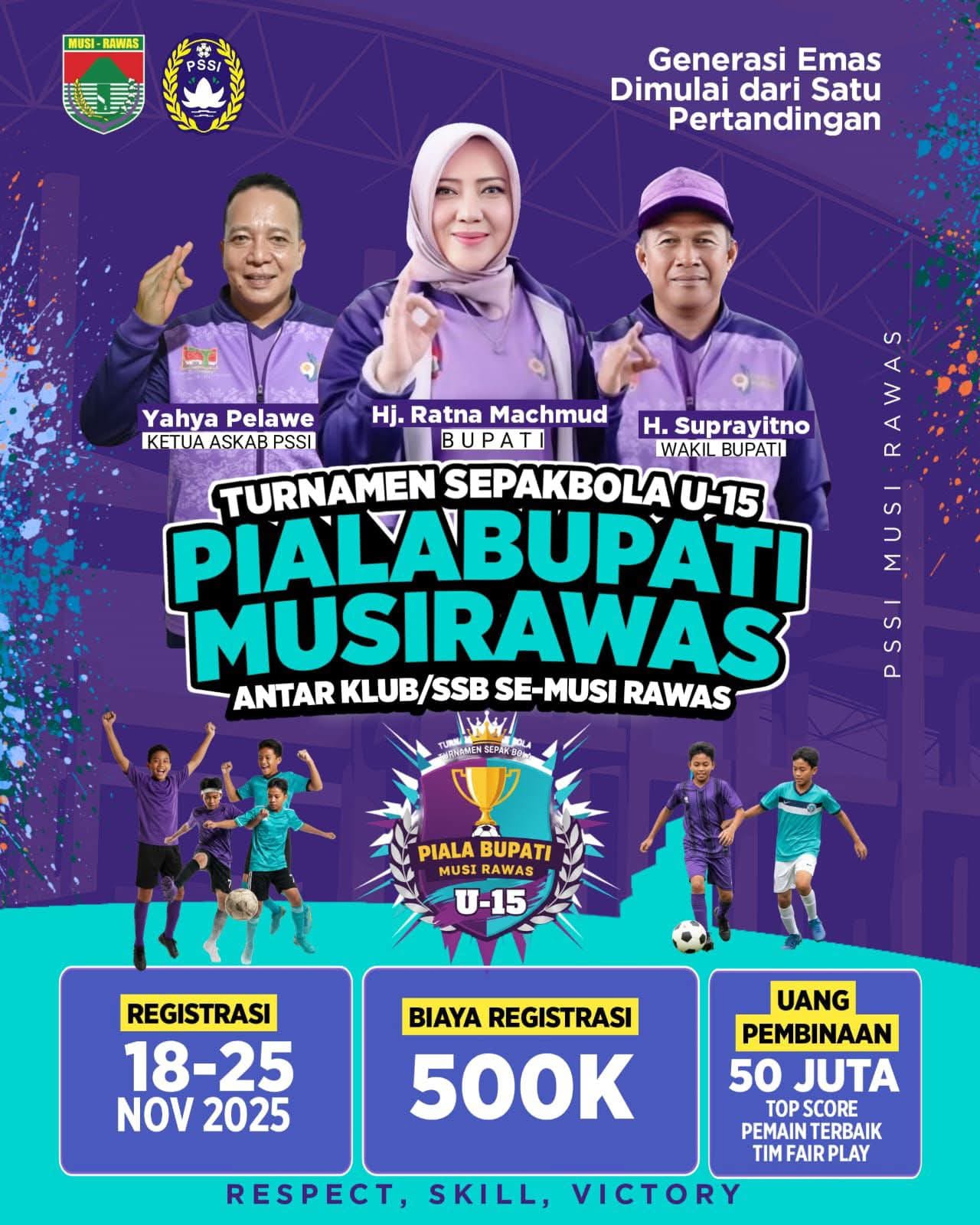 MUSI RAWAS (SUMSEL) SUARAPANCASILA.ID – Persatuan Sepakbola Seluruh Indonesia (PSSI) Kabupaten Musi Rawas bersama Pemerintah Kabupaten Musi Rawas melalui Dinas Pemuda dan Olahraga (Dispora) menggelar Turnamen Sepak Bola Piala Bupati Musi Rawas Cup U-15 Tahun 2025.