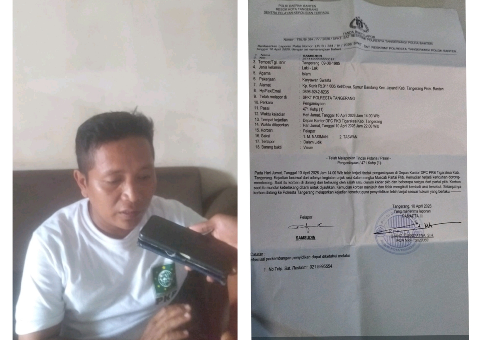 KABUPATEN TANGERANG (BANTEN) SUARAPANCASILA.ID – Acara persiapan Musyawarah Cabang (Muscab) Partai Kebangkitan Bangsa tingkat Kabupaten Tangerang yang digelar pada Jumat (10/4/2026) berujung ricuh. Insiden tersebut kini berbuntut laporan polisi setelah salah satu peserta, Samsudin, mengaku menjadi korban dugaan pengeroyokan.