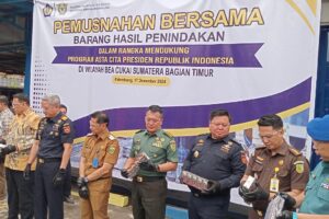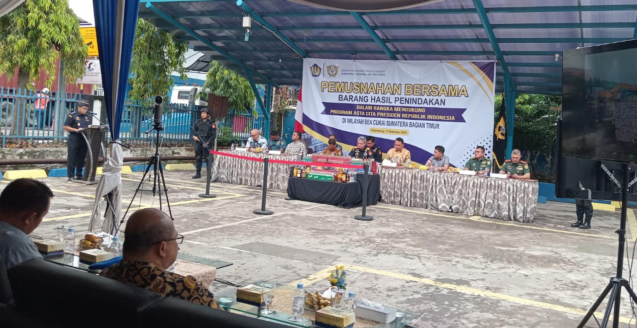 PALEMBANG (SIMSEL), SUARAPANCASILA.ID – Direktorat Jenderal Bea dan Cukai (DJBC) kantor wilayah Sumatera Bagian Timur (Sumbagtim) melaksanakan pemusnahan bersama barang hasil penindakan, dalam rangka mendukung program Asta Cipta Presiden Indonesia di wilayah Bea Cukai Sumbagtim di halaman KPPBC Bea cukai Sumbagtim Palembang, Selasa (17/12/2024).