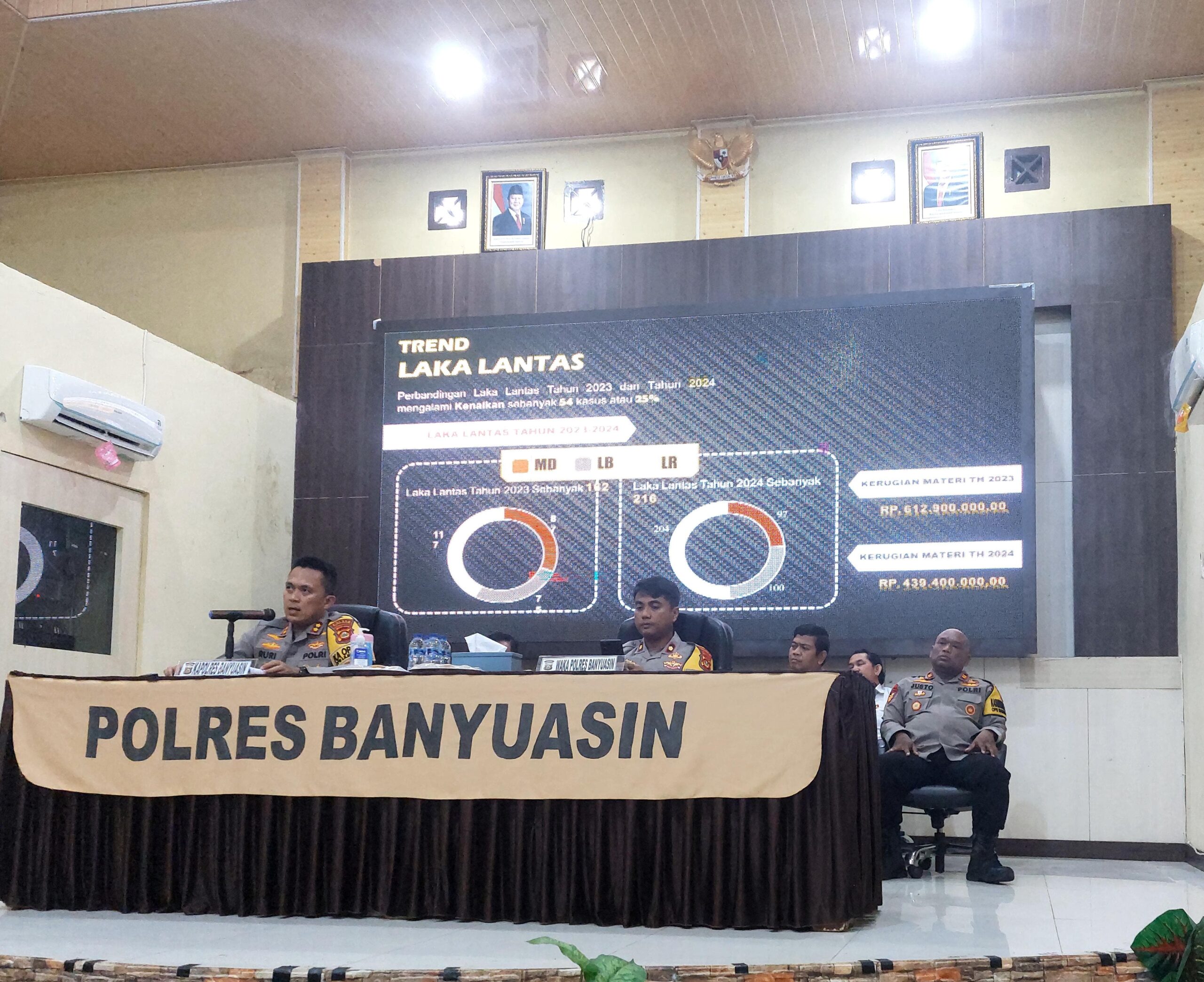 Sedangkan angka kecelakaan lalu lintas, Ruri menegaskan tahun 2024 terdapat 216 kasus, naik 54 kasus atau 25 % dibandingkan 2023 hanya 162 kasus. Lakalantas (MD/LB/LR) ini menjadi perhatian karena Banyuasin mempunyai jalan yang panjang, tidak ada trafik light dan minim rambu lalu lintas.