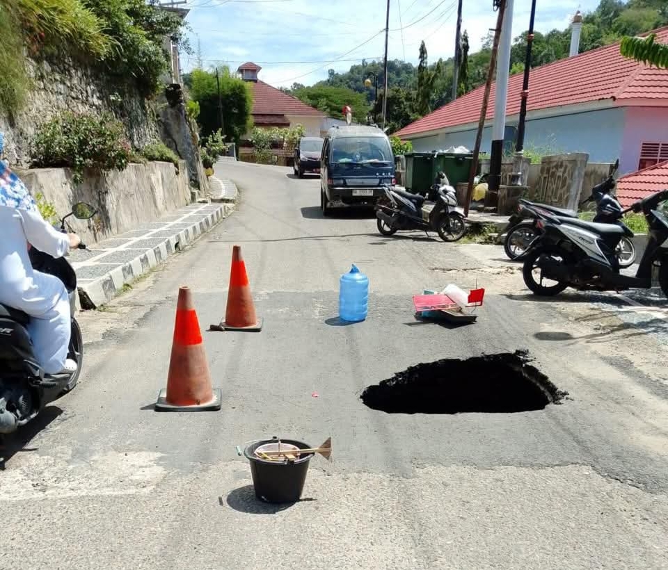 SAWAHLUNTO (SUMBAR) SUARA PANCASILA.ID — Ruas jalan akses menuju Rumah Sakit Umum Daerah (RSUD) Kota Sawahlunto kembali mengalami kerusakan parah berupa lubang dan amblas pada Kamis siang, (23/10/2025).
