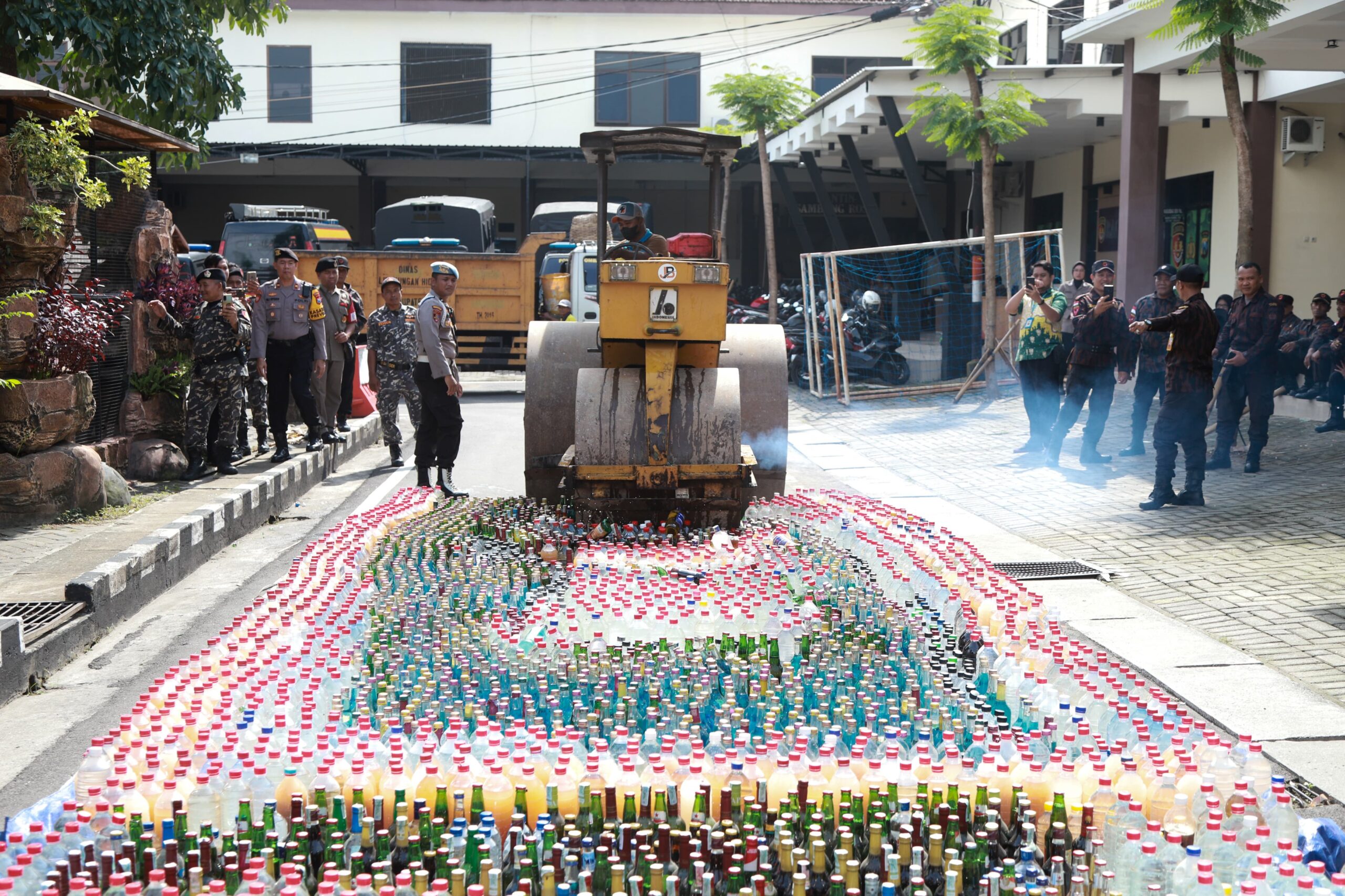 3.627 botol miras tersebut ditata di atas matras plastik dan dihancurkan secara simbolis dengan cara dilempar hingga pecah, kemudian dilanjutkan dengan penggunaan alat berat jenis selender untuk melindas sisa botol yang ada.