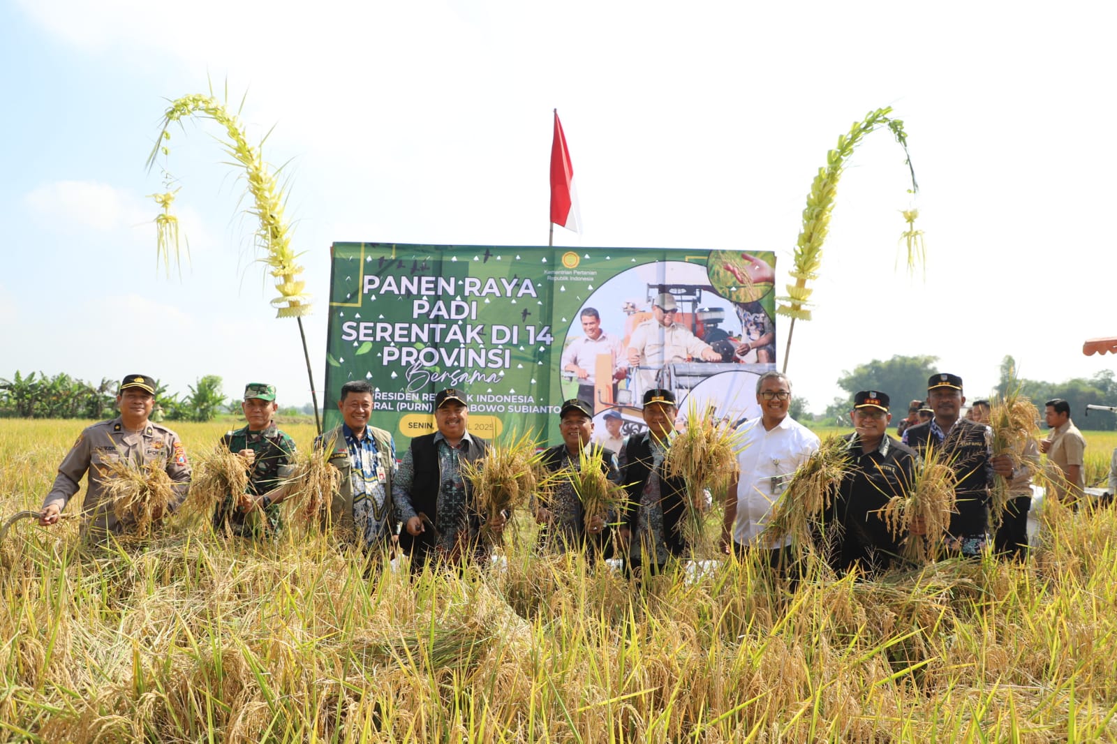 Abah Warsubi, begitu sapaan Bupati Jombang, didampingi Wakil Bupati Salmanudin S.Ag., M.Pd., Sekdakab Jombang Agus Purnomo S.H., M.Si., Perwakilan Forkopimda, Asisten, dan Kepala OPD terkait turun langsung ke sawah untuk melakukan panen raya secara simbolis menggunakan sabit dan Combine Harvester (mesin panen padi).