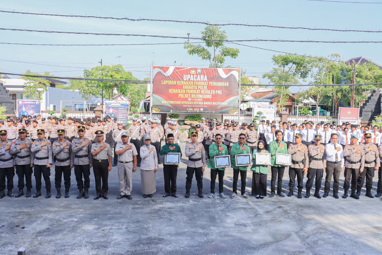 KAB BOJONEGORO (JATIM) SUARAPANCASILA.ID – Kapolres Bojonegoro AKBP Afrian Satya Permadi, SH, SIK, MIK memberikan penghargaan kepada enam warga berprestasi dalam sebuah upacara di halaman Mapolres Bojonegoro, Senin (29/9/2025).