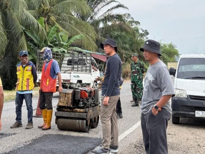 Personel Polres Musi Rawas Utara bersama unsur Forkopimda melaksanakan pembersihan sampah, penambalan jalan berlubang, serta penertiban rumput liar secara serentak.