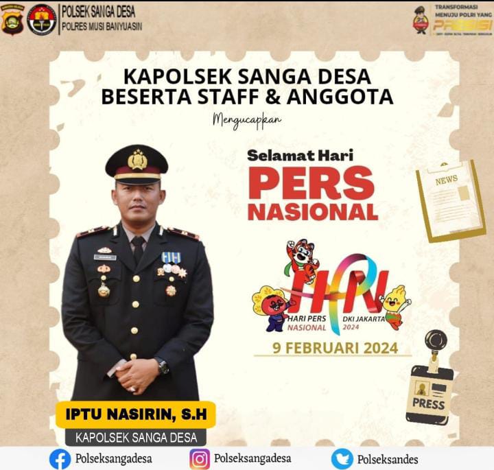 PALEMBANG, SUARAPANCASILA.ID – Kapolsek Sanga Desa beserta Staf dan Anggota mengucapkan selamat Hari Pers Nasional, tepatnya 9 Februari 2024 diperingati sebagai Hari Pers Nasional(HPN). Peringatan ini selalu hadir di setiap tahunnya karena ini adalah hari besar bagi insan pers.