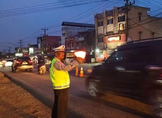 BANYUASIN , SUARAPANCASILA.ID – Kasat Lantas Polres Banyuasin AKP Indrowono SH MSi pimpin langsung personil Sat Lantas Polres Banyuasin melaksanakan pengaturan dan penguraian kepadatan arus lalu lintas di Jalintim Palembang – Jambi Kecamatan Talang Kelapa, Jum’at (12/4) sore.