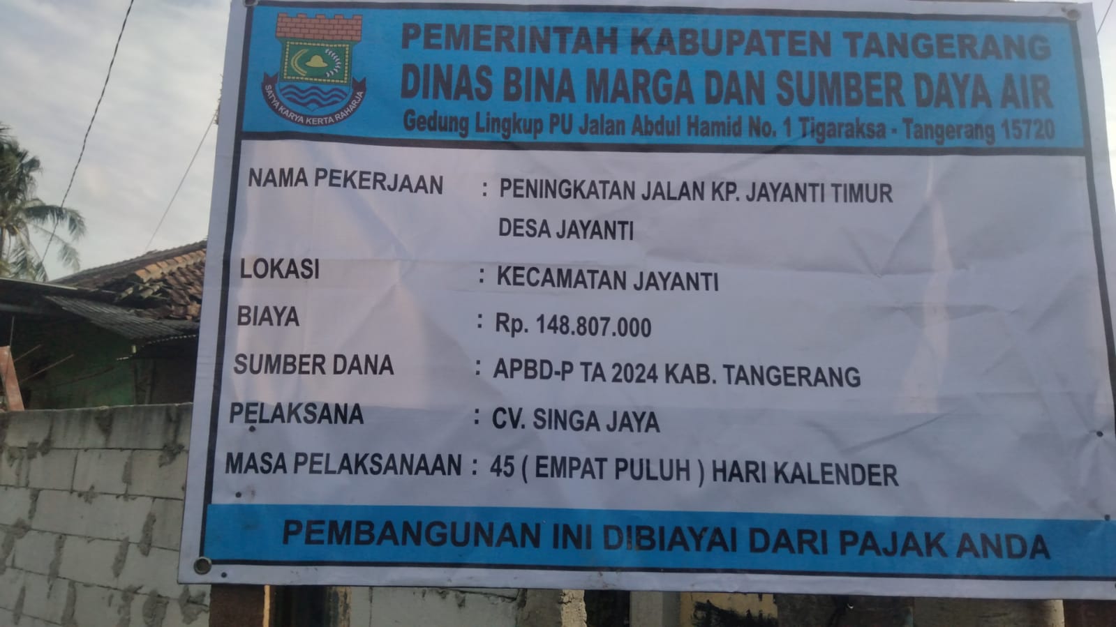KABUPATEN TANGERANG,(BANTEN)- SUARAPANCASILA.ID – Kegiatan Dinas diakhir tahun sering menjadi sorotan publik, kali ini Dinas Bina Marga Dan Sumber Daya Air Kabupaten Tangerang melakukan kegiatan dengan judul, Peningkatan Jalan Kp.Jayanti Timur, Desa Jayanti, Kecamatan Jayanti, dengan anggaran biaya Rp.148.807.000; bersumber dana APBD-P TA-2024 Kabupaten Tangerang, pelaksana proyek CV. SINGA JAYA, masa pelaksanaan 45 (Empat Puluh Lima Hari) Kalender, pembangunan dibiayai oleh pajak yang masyarakat bayarkan. Jumat (19/12/24)