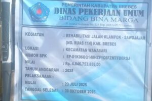 KAB BREBES (JATENG) SUARAPANCASILA.ID – Pemerintah Kabupaten Brebes melalui Dinas Pekerjaan Umum Bidang Bina Marga tengah melaksanakan proyek rehabilitasi jalan Klampok–Sawojajar (No. Ruas 114) di Kecamatan Wanasari. Proyek ini menelan anggaran sebesar Rp.4.846.753.856,00 dari APBD tahun anggaran 2025 dan dikerjakan oleh CV. Fakhrul Jaya. Berdasarkan papan proyek, kegiatan dimulai pada 23 Juli dan dijadwalkan selesai pada 30 Oktober 2025.