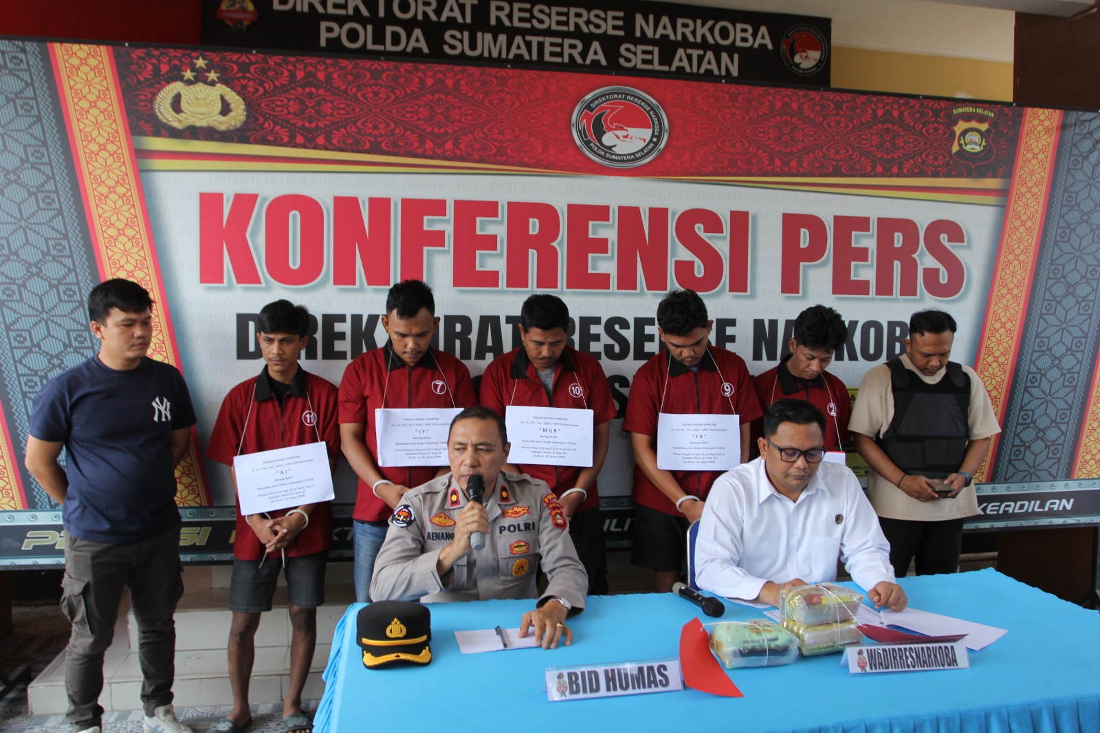 Wakil Direktur Reserse Narkoba Polda Sumsel AKBP Harissandi didampingi Kaur Pensat Subbid Penmas Bidhumas Polda Sumsel Kompol Menang, SH, MSi menuturkan penangkapan kelima tersangka berawal dari tersangka Rama Habibi yang lebih dulu ditangkap membawa 1 kilogram sabu-sabu di dalam mobil Sigra warna hitam nopol BG 1167 OU.