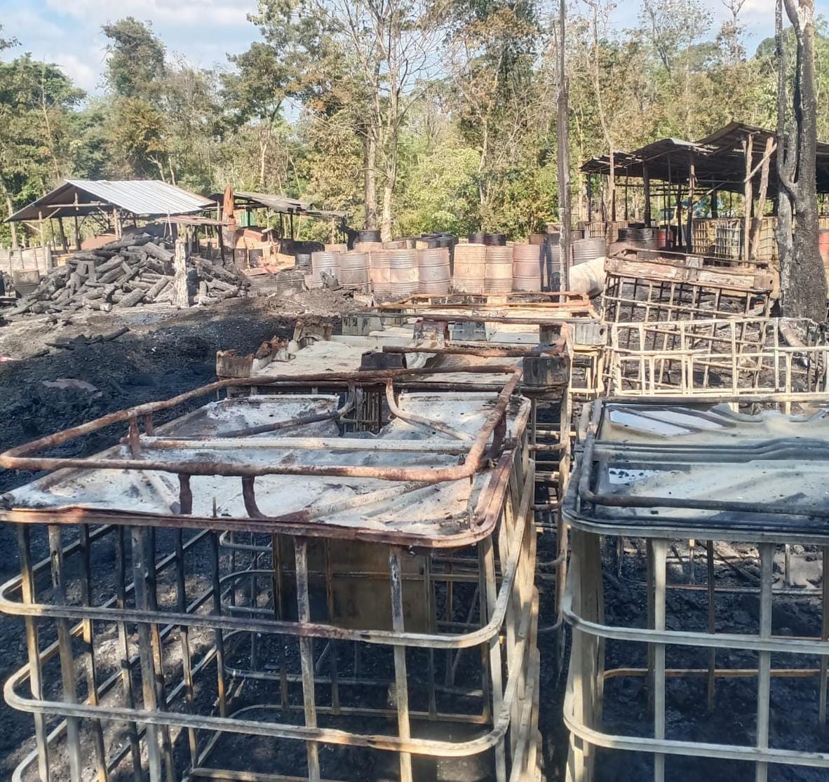 Dari informasi yang diterima media ini, terlihat lokasi puluhan kerangka bekas tedmon, ratusan drum, dan tungku masakan menghitam akibat dilalap api.