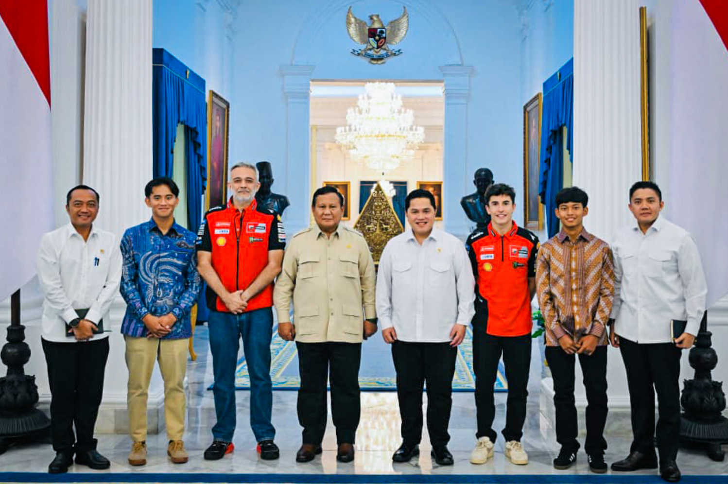 NASIONAL, SUARAPANCASILA.ID – Presiden Republik Indonesia, Prabowo Subianto, menerima kunjungan juara dunia MotoGP, Marc Marquez, bersama dua pembalap muda Indonesia, Mario Aji dan Veda Ega Pratama, di Istana Merdeka, Jakarta, Selasa (30/9/2025).