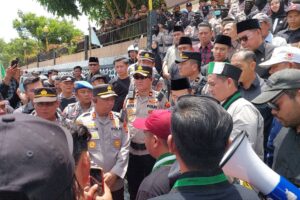 Kapolres Adithia terlihat hadir di lokasi sejak awal, didampingi oleh sejumlah pejabat utama Polres, termasuk Wakapolres Kompol M. Syamsul Zachri, dan Kabagops Kompol Robi Sugara. Mereka tidak hanya berdiri di belakang barisan pengamanan, melainkan memilih untuk berada di garis depan, berinteraksi langsung dengan massa aksi.