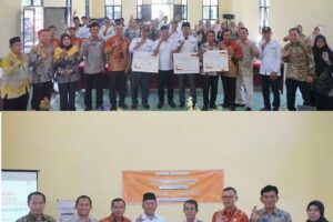 Officer Relation Communication & Enhancement Area 1 Medco E&P Indonesia Robby Wijaya dan Public Relation Sele Raya Merangin Dua, Tanheri bersama Ketua PWI Musi Rawas Jhuan Silitonga menyerahkan secara langsung paket bantuan tersebut kepada Sekretaris Lurah Bangun Jaya Fajarudin, S.IP. dan Sekretaris Desa Pelawe Eniko serta perwakilan penerima manfaat di Kantor Lurah Bangun Jaya dan Balai Desa Pelawe.