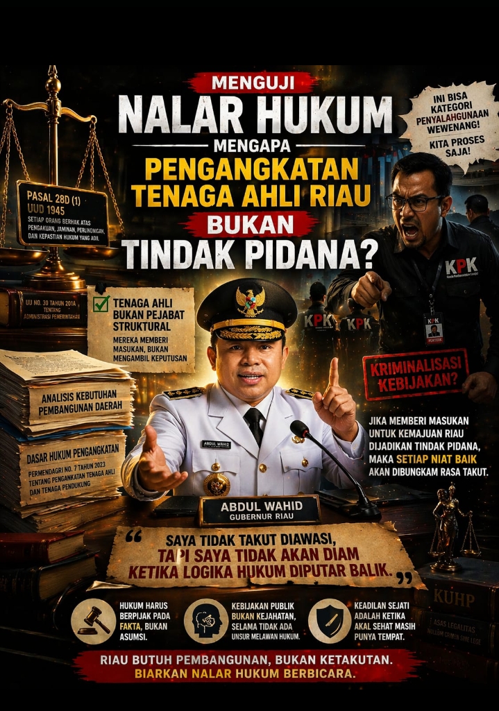 PEKANBARU-(RIAU)-Persidangan dugaan korupsi yang menyeret Gubernur Riau nonaktif, Abdul Wahid, mulai memunculkan diskursus hukum yang sangat menarik untuk dibedah. Dalam persidangan yang digelar di Pengadilan Tipikor Pekanbaru pada Kamis, 9 April 2026, kesaksian Sekretaris Daerah (Sekda) Riau mengenai pengangkatan Dani Nursalam dan Tata Maulana sebagai Tenaga Ahli (TA) menjadi pusat perhatian. Narasi yang dibangun oleh Jaksa Penuntut Umum (JPU) seolah-olah ingin menggiring opini publik bahwa kebijakan pengangkatan tersebut adalah sebuah “perbuatan melawan hukum” hanya karena tidak lagi dianggarkan dalam APBD Riau sejak tahun 2025.