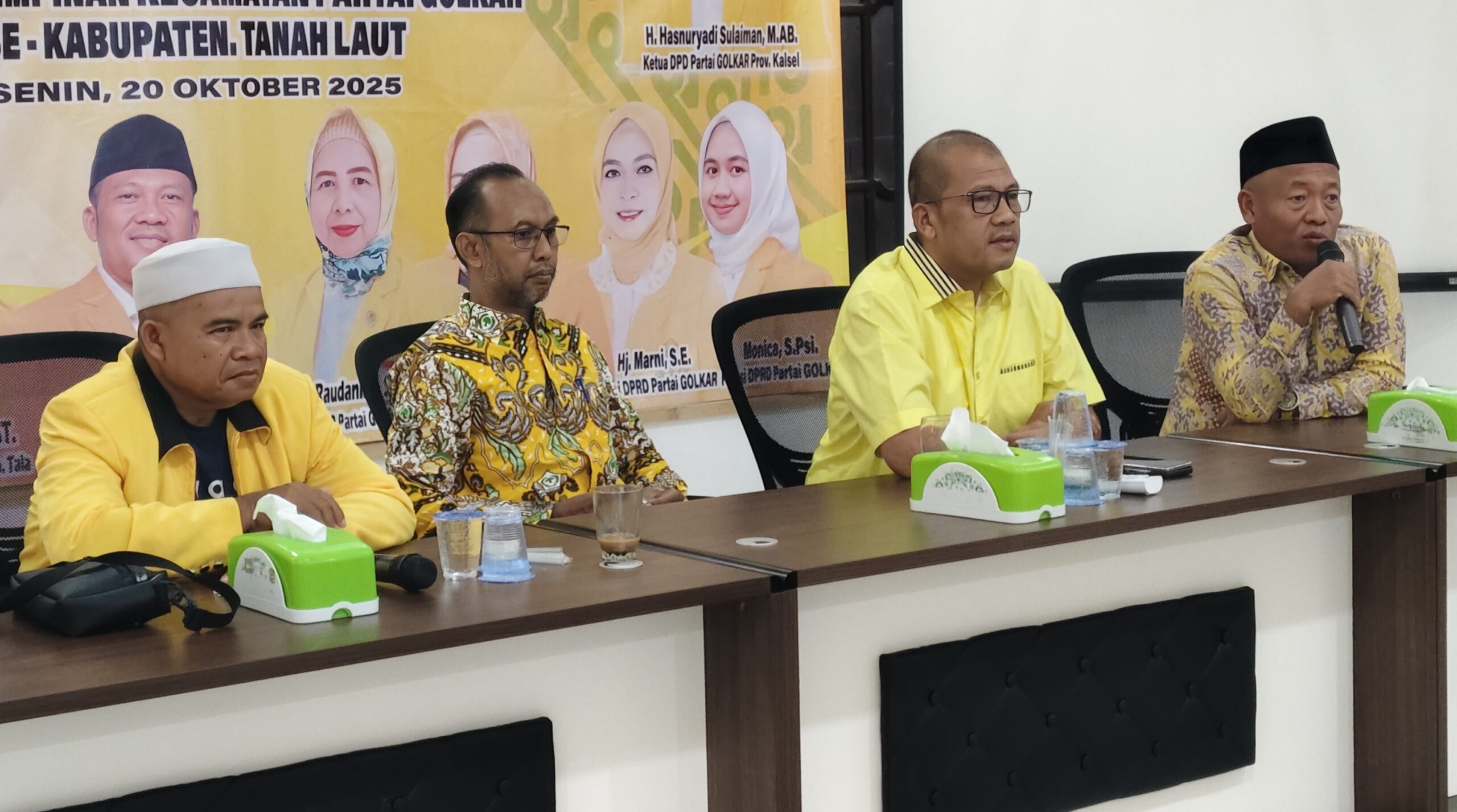 Pelaihari(KALSEL), SUARA PANCASILA.ID — Aula DPD Partai Golkar Kabupaten Tanah Laut, Senin (20/10/2025) sore, dipenuhi semangat kekeluargaan dan warna kuning kebanggaan partai. Dalam suasana yang hangat namun penuh makna, Dewan Pimpinan Daerah (DPD) Partai Golkar Tanah Laut menggelar Rapat Kerja Daerah (Rakerda) bersama seluruh Pimpinan Kecamatan Partai Golkar se-Kabupaten Tanah Laut dan anggota Fraksi Partai Golkar DPRD Tanah Laut.