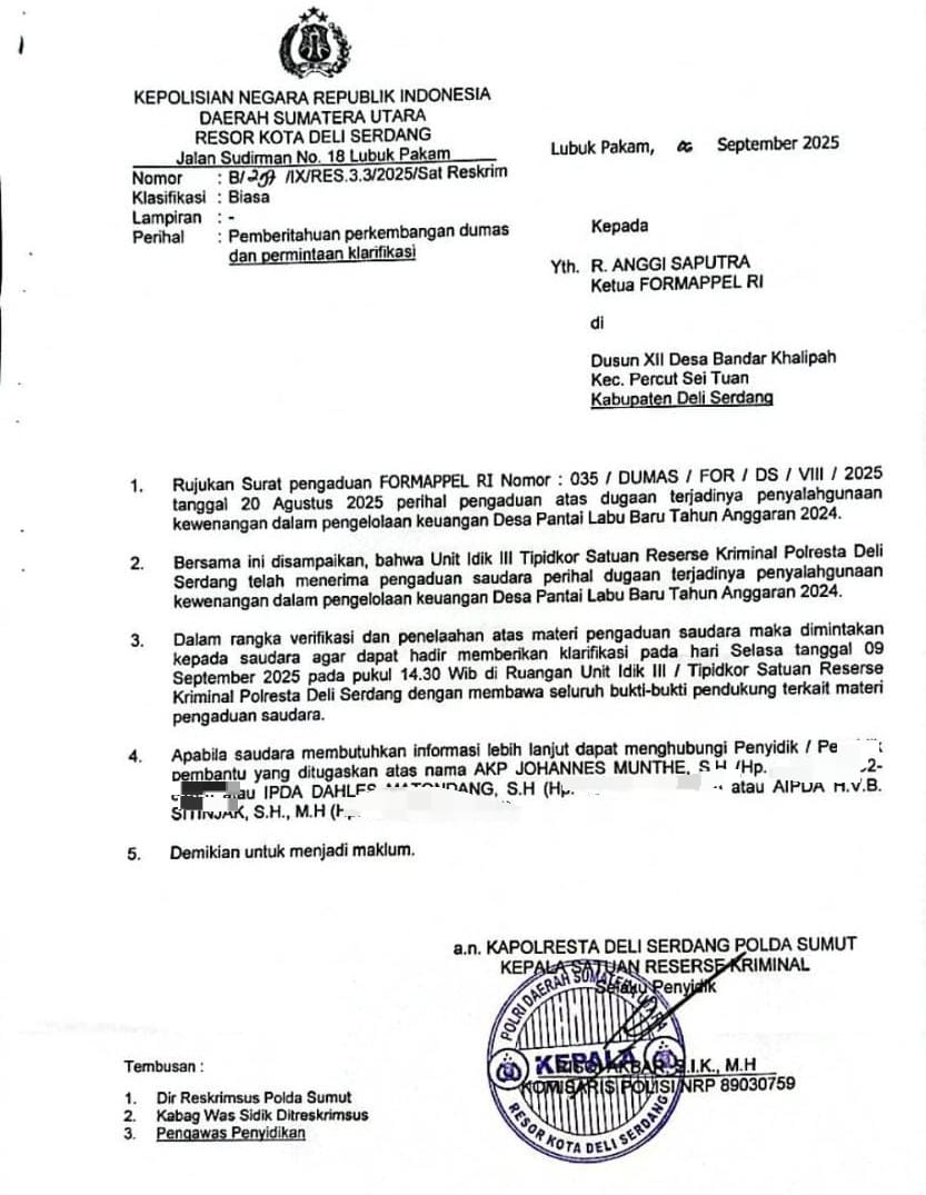 Sebelumnya, FORMAPPEL RI secara resmi melayangkan pengaduan masyarakat (DUMAS) bernomor 035/DUMAS/FOR/DS/VIII/2025 kepada Kapolresta Deli Serdang cq. Kasat Reskrim dan Kanit Tipikor. Dalam aduan tersebut, FORMAPPEL menyoroti indikasi penyalahgunaan anggaran Dana Desa Pantai Labu Baru yang nilainya mencapai Rp1,2 miliar.