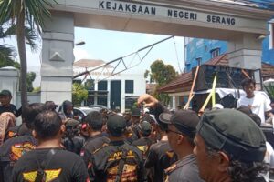 KOTA SERANG (BANTEN) SUARAPANCASILA.ID – Ratusan anggota Organisasi Masyarakat (Ormas) Laskar Pendekar Banten Sejati (Lapbas) Indonesia menggelar aksi damai di depan Kantor Kejaksaan Negeri (Kejari) Kota Serang, Rabu (8/10/2025).