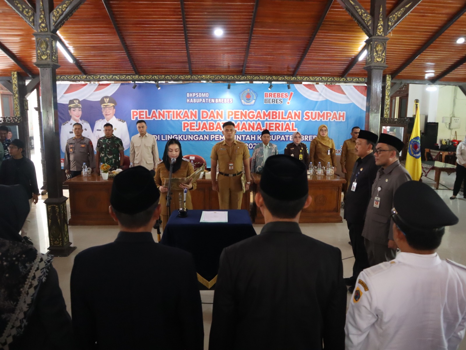 Pelantikan dan pengambilan sumpah jabatan berlangsung di Pendopo Kabupaten Brebes, dihadiri Wakil Bupati Wurja Sekretaris Daerah Tahroni, jajaran Forkopimda, Ketua Komisi I DPRD Brebes, para kepala OPD, serta Ketua TP PKK Brebes Ahmad Saeful Ansori.