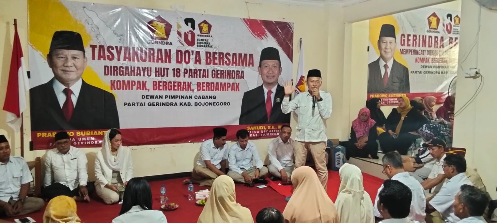 Ketua DPC Partai Gerindra sekaligus Wakil Ketua DPRD Bojonegoro Sahudi mengatakan, bahwa di ulang tahun ke-18 Partai Gerindra hari ini persis pada hari Jum’at tanggal 6 Februari tahun 2026.