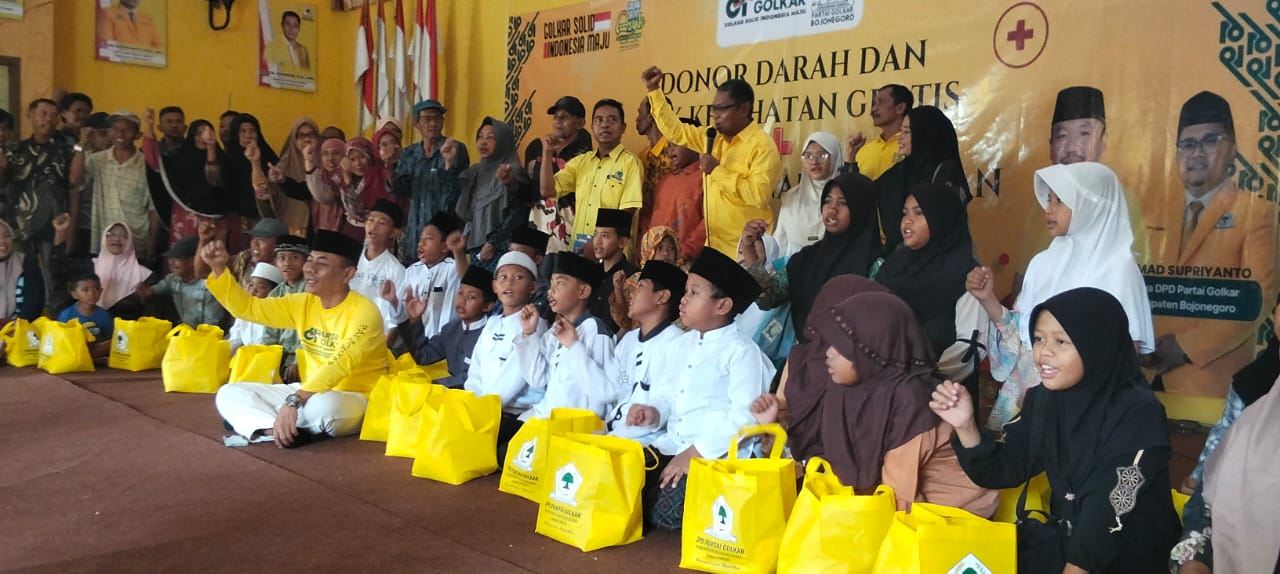 Kegiatan bakti sosial berupa santunan anak yatim dan pra sejahtera, cek kesehatan gratis, donor darah digelar di DPD Golkar Kabupaten TBojonegoro.