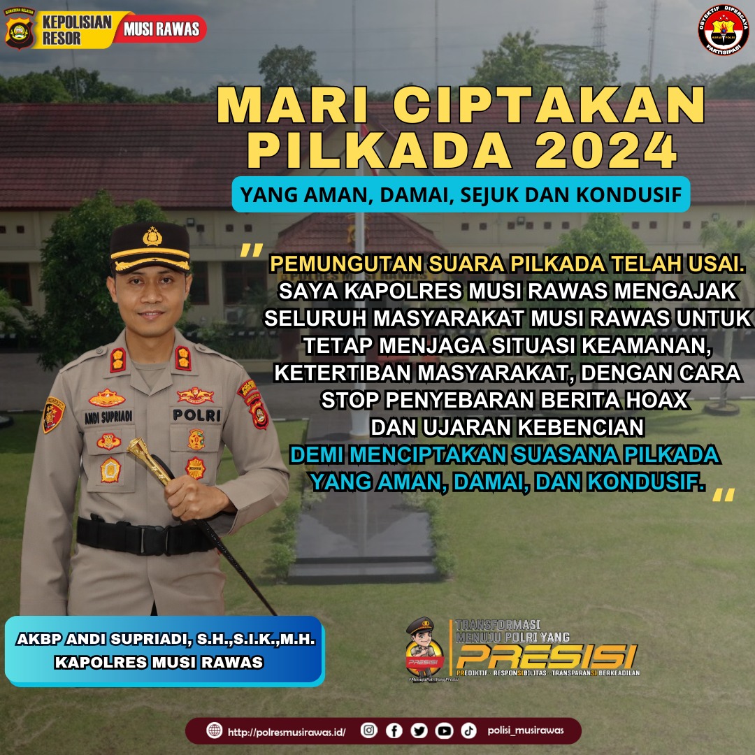 MUSI RAWAS (SUMSEL), SUARAPANCASILA.ID – Kapolres Musi Rawas, (Mura) AKBP Andi Supriadi, SH.,S.I.K.,M.H. Memberikan himbauan kepada masyarakat Kabupaten Musi Rawas pasca pemungutan suara Pilkada Gubernur Sumatera Selatan dan Pilkada Bupati Mura 2024.