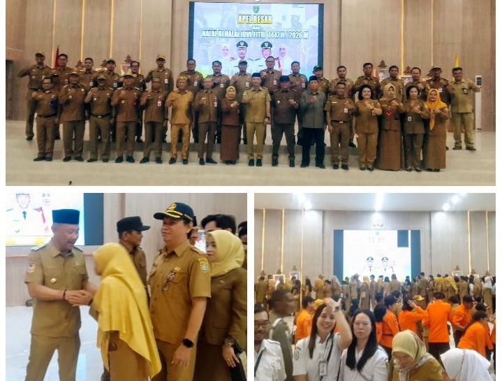 BARITO SELATAN (KALTENG)- SUARAPANCASILA.ID- Pemerintah Kabupaten Barsel menggelar Apel Besar dan Halal Bi Halal Idul Fitri 1447 H / 2026 M, Senin 30 Maret 2026. Kegiatan yang seyogyanya dilaksanakan di Halaman Kantor Bupati, namun karena hari hujan, sehingga pelaksanaan dialihkan ke Aula Kantor Bupati Barsel.