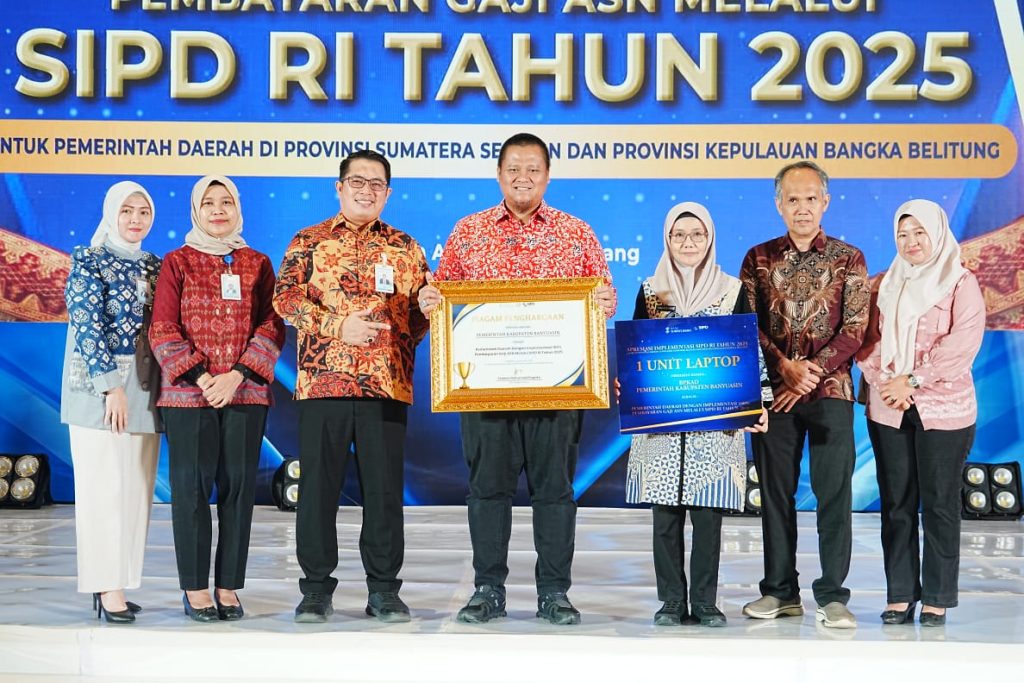 PALEMBANG (SUMSEL), SUARAPANCASILA.ID — SUARAPANCASILAID – Mewakili Bupati Banyuasin, Sekretaris Daerah Banyuasin, Ir. Erwin Ibrahim, ST., MM., MBA., IPU., ASEAN. Eng bersama Kepala BPKAD Banyuasin, Dra. Yuni Khairani, M.Si menerima Penghargaan sebagai Pemerintah Daerah Dengan Implementasi 100% Pembayaran Gaji ASN Melalui SIPD RI Tahun 2025 dalam Acara Apresiasi Implementasi Pembayaran Gaji ASN melalui Sistem Informasi Pemerintah Daerah (SIPD) RI Tahun 2025 untuk pemerintah daerah Provinsi Sumatera Selatan dan Provinsi Kepulauan Bangka Belitung digelar di Ballroom Hotel Aryaduta Palembang, Kamis (29/01/2026).