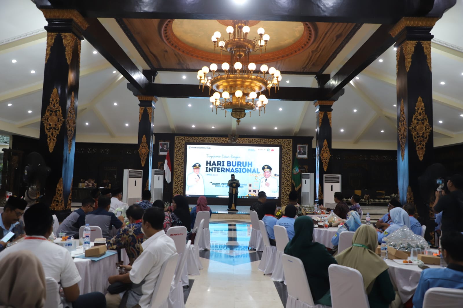 JOMBANG (JATIM).SUARAPANCASILA.ID – Pemerintah Kabupaten Jombang menggelar tasyakuran dalam rangka memperingati Hari Buruh Internasional (May Day) Tahun 2026 di Pendopo Kabupaten Jombang, Kamis (30/4/2026). Kegiatan berlangsung dalam suasana aman, tertib, dan penuh kebersamaan, melibatkan unsur pemerintah, pengusaha, serta Serikat pekerja.
