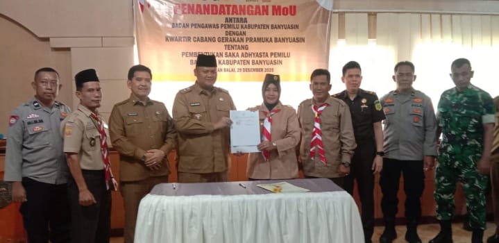 PANGKALAN BALAI (SUMSEL), SUARAPANCASILA.ID – Badan Pengawas Pemilu (Bawaslu) Kabupaten Banyuasin bersama Kwartir Cabang Gerakan Pramuka Kabupaten Banyuasin resmi menandatangani Nota Kesepahaman (MoU) sekaligus melantik kepengurusan Satuan Karya (Saka) Adhyasta Pemilu Kabupaten Banyuasin. Upaya ini sebagai bentuk nyata memperkuat pengawasan partisipatif, khususnya di kalangan pemilih pemula.