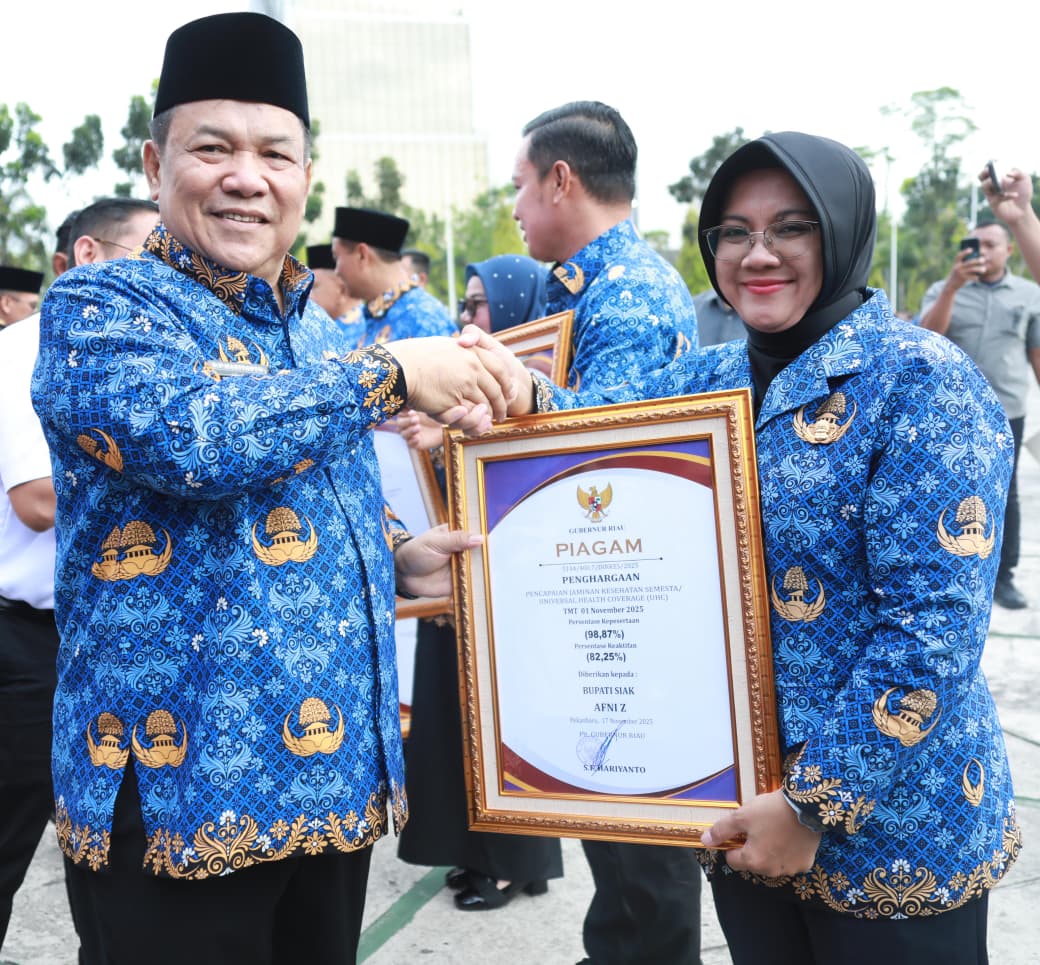 SIAK (RIAU), SUARAPANCASILA.ID – Kabupaten Siak meraih Piagam Penghargaan Universal Health Coverage (UHC) pada peringatan Hari Kesehatan Nasional (HKN) tahun 2025.