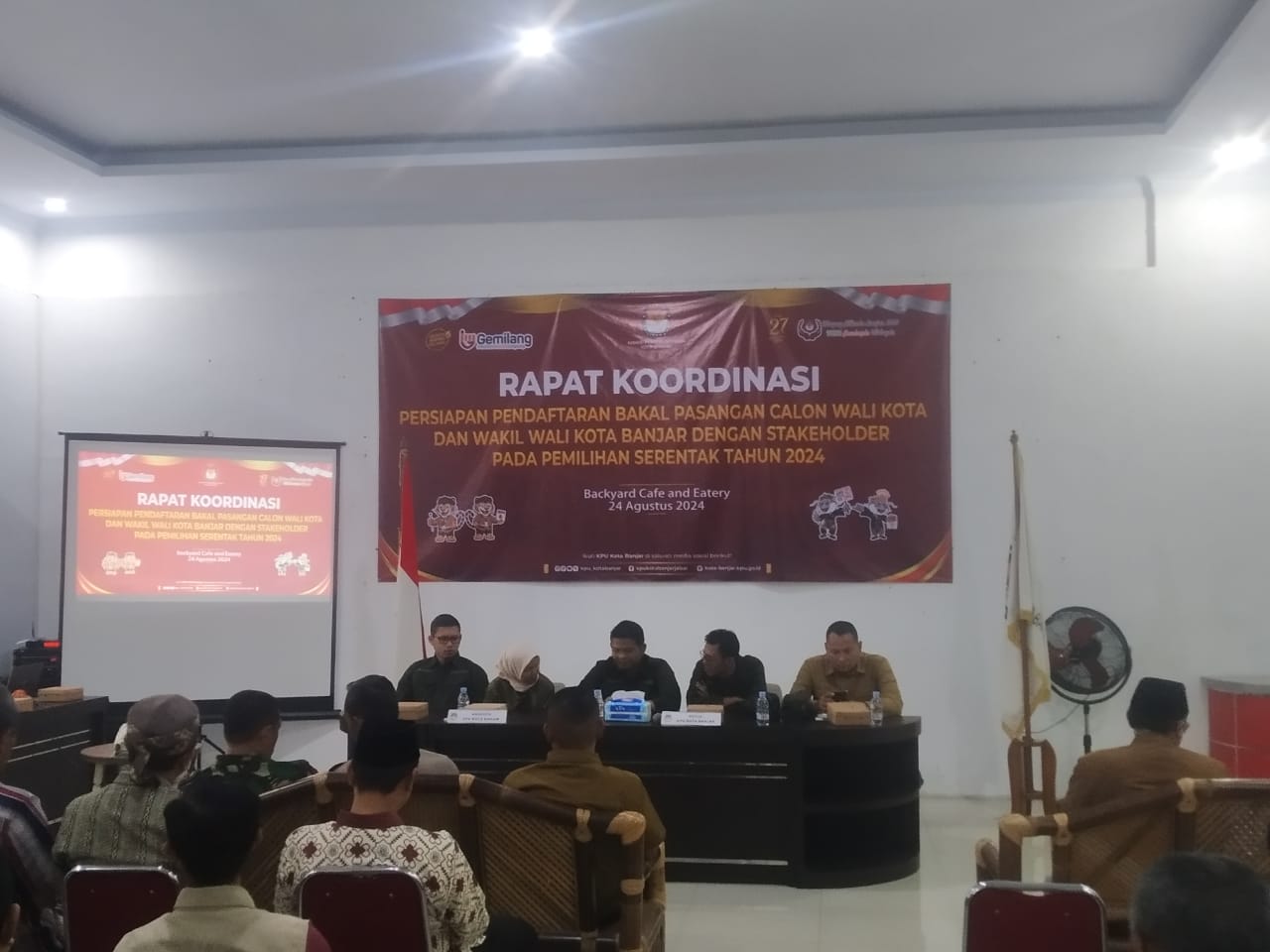 KOTA BANJAR (JABAR), SUARAPANCASILA.ID -Komisi Pemilihan Umum (KPU) Kota Banjar menggelar rapat koordinasi persiapan pendaftaran bakal pasangan calon Walikota dan wakil Walikota Banjar dengan Stakeholder pada pemilihan serentak tahun 2024. yang berlokasi di salah satu aula Cafe di Kota Banjar Sabtu (24/8/24).