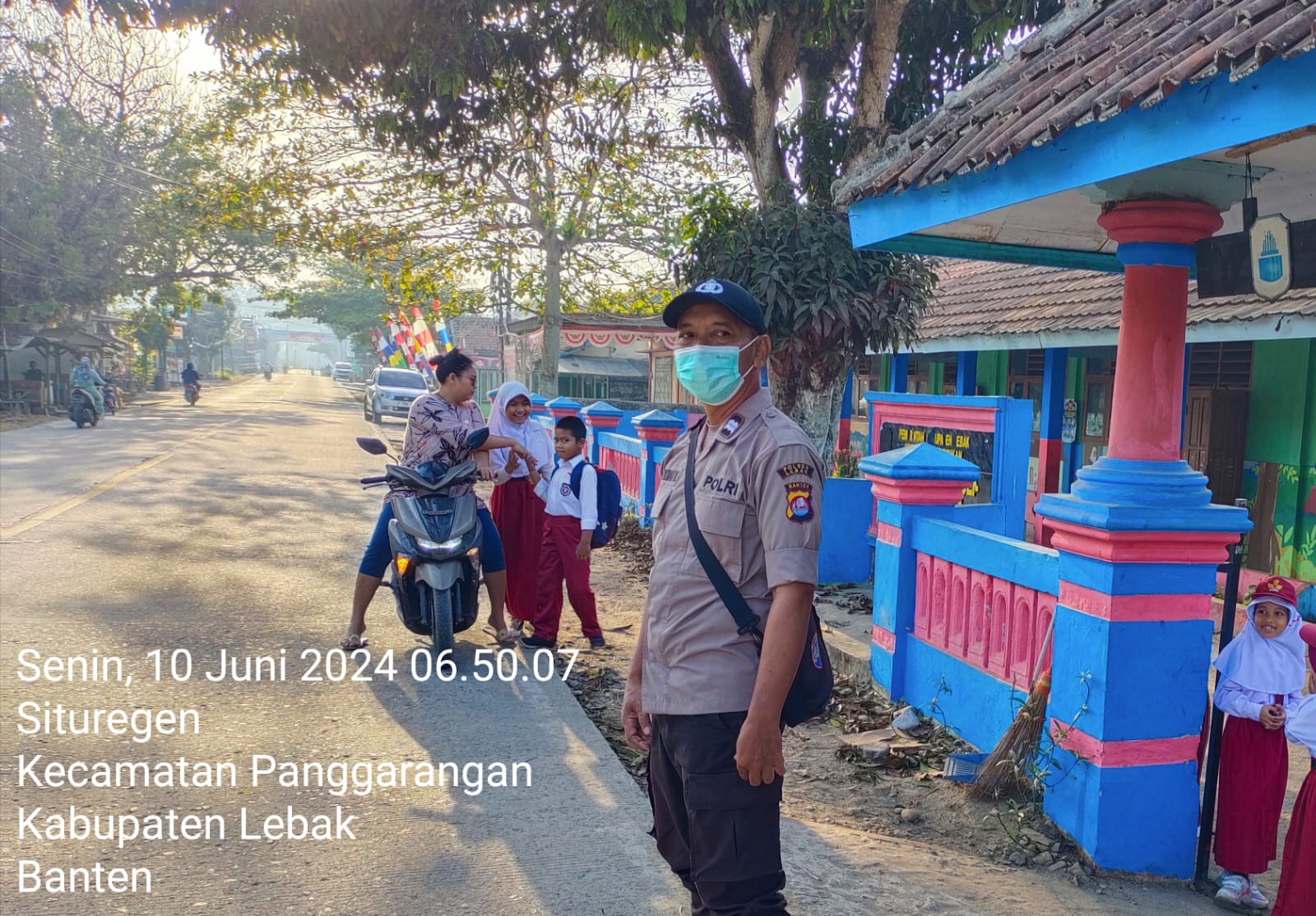 Guna Pastikan aman Aiptu Cecep Rakhmat Hidayat (Kanit Binmas), Polsek Panggarangan Polres Lebak melaksanakan kegiatan “strong point” didepan TK dan SD Negeri 1 Situregen, Desa Situregen, Kecamatan Panggarangan, Kabupaten Lebak, Banten. Senin pagi (20/06/2024). Pukul 06.50. wib s/d selesai