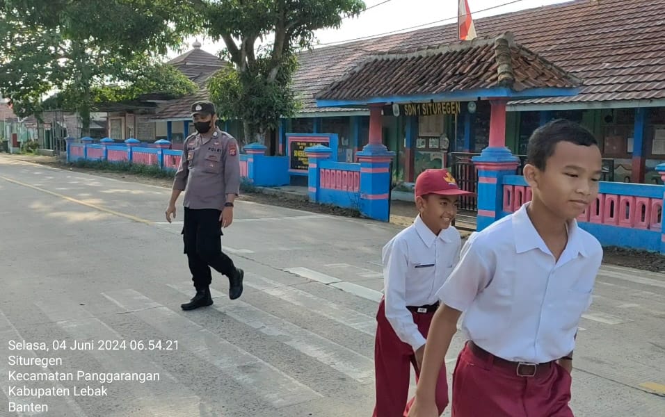 Guna Pastikan aman Bripka Atep Eka Mulyadi (Bhabinkamtibmas), Polsek Panggarangan Polres Lebak melaksanakan kegiatan “strong point” didepan TK dan SD Negeri 1 Situregen, Desa Situregen, Kecamatan Panggarangan, Kabupaten Lebak, Banten. Selasa (04/06/2024). Pukul 06.45. wib s/d selesai