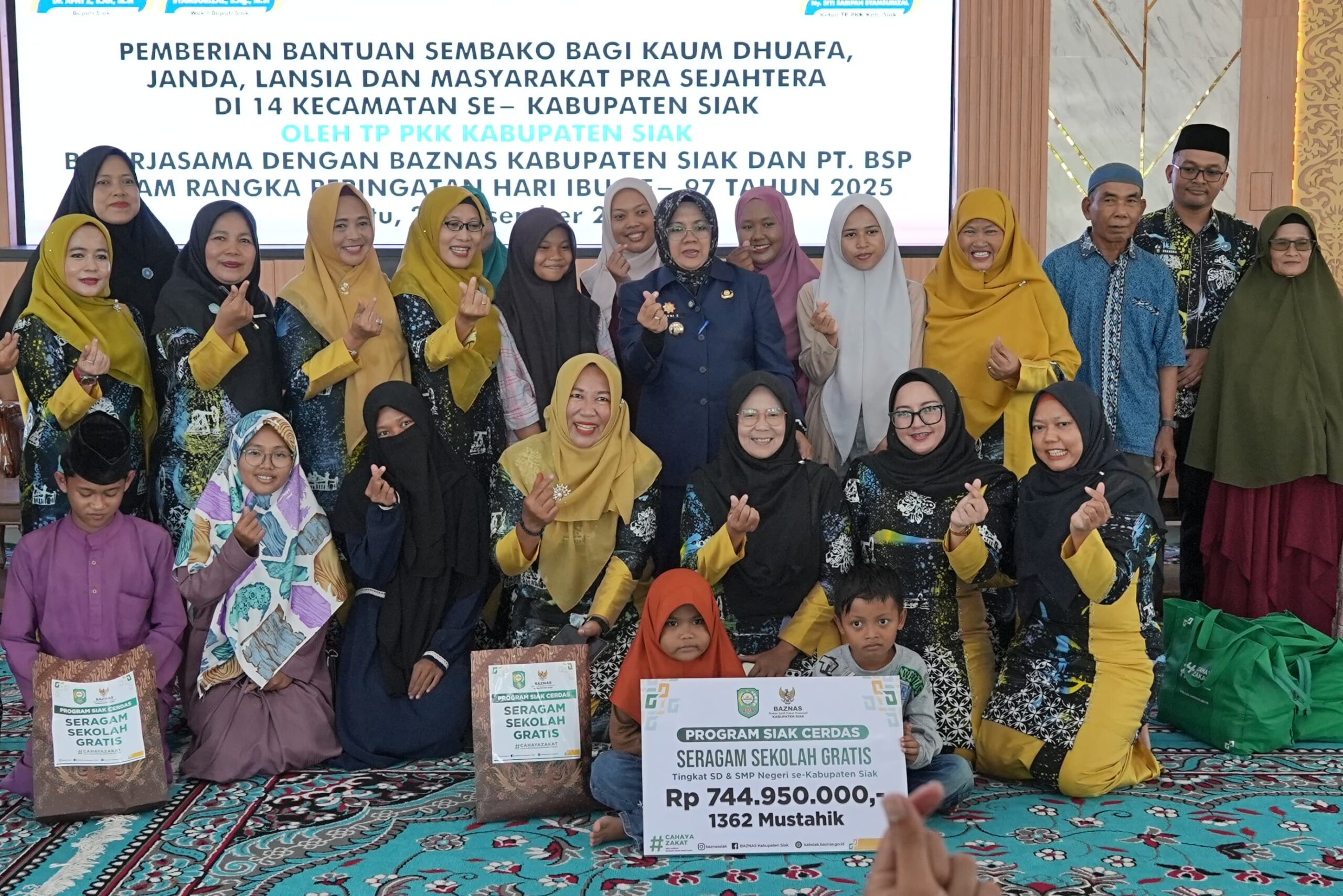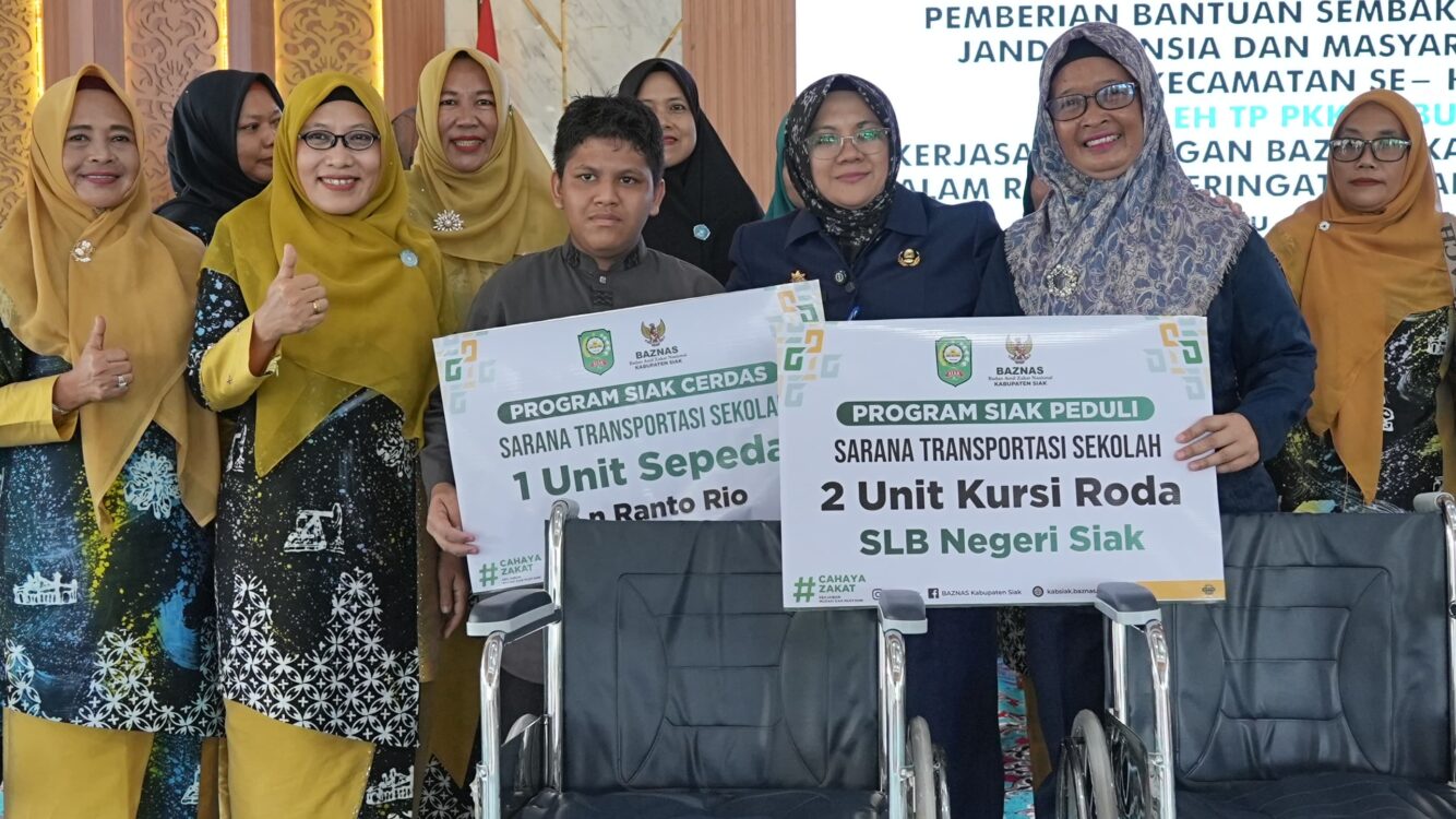SIAK (RIAU), SUARAPANCASILA.ID – TP PKK Kabupaten Siak bersama BAZNAS Kabupaten Siak dan PT Bumi Siak Pusako menyalurkan bantuan sembako kepada kaum dhuafa, janda, lansia, serta masyarakat pra sejahtera di 14 kecamatan se-Kabupaten Siak.