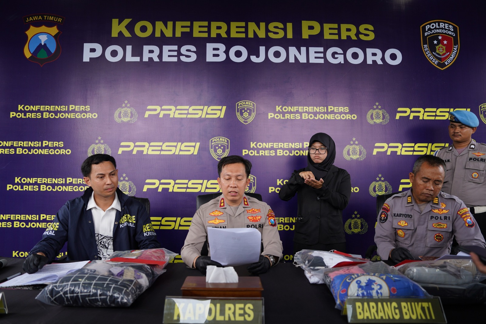 Kapolres Bojonegoro AKBP Afrian Satya Permadi menyampaikan langsung hasil ungkap kasus tersebut dalam konferensi pers yang digelar di lobi Mapolres Bojonegoro, Rabu (15/4/2026). Ia didampingi Kasat Reskrim AKP Cipto Dwi Leksana dan Kasi Humas AKP Karyoto.