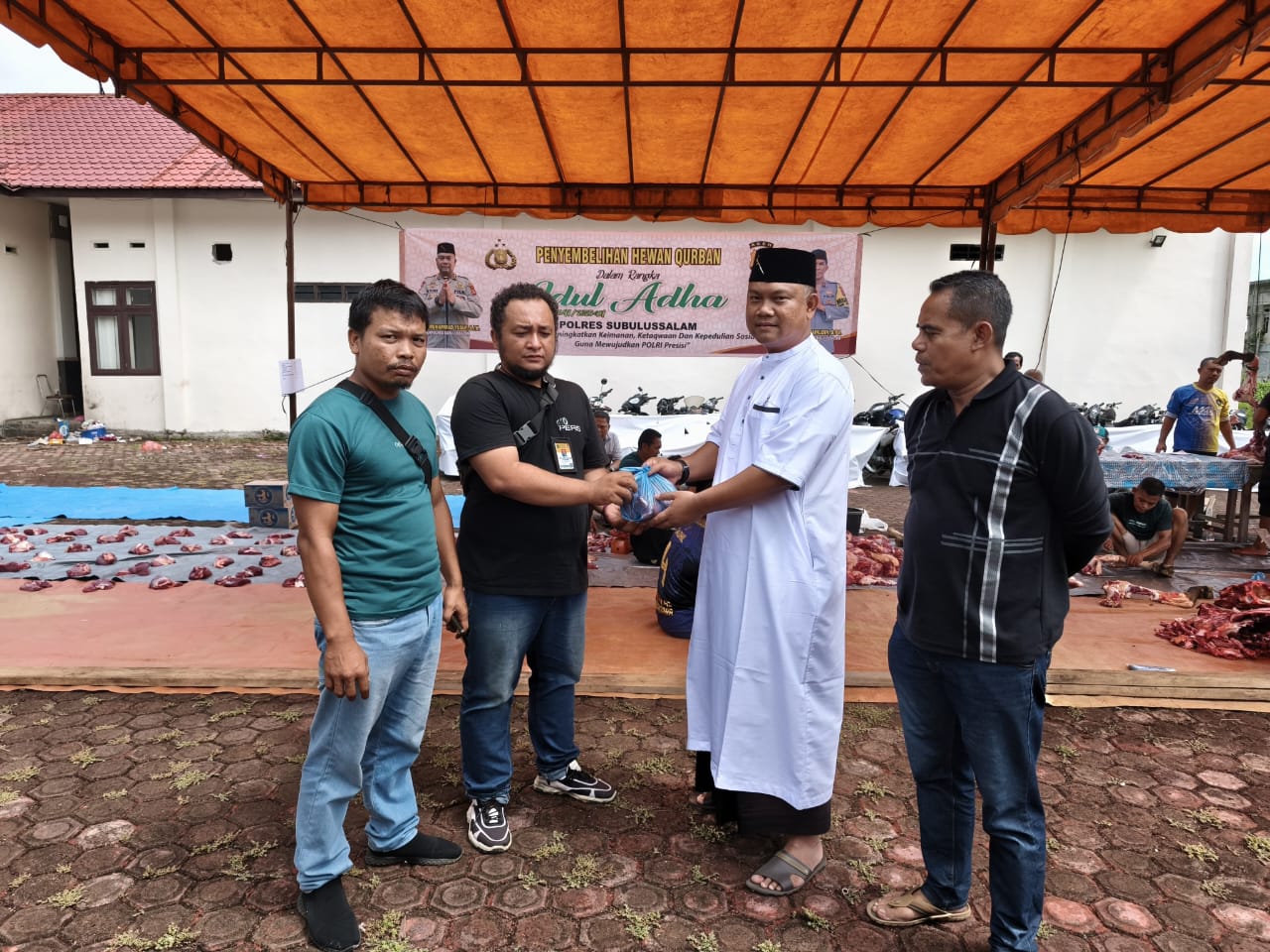 Kapolres Subulussalam AKBP Muhammad Yusuf membagikan secara simbolis kepada masyarakat. Memawakili kaum bapak dan ibu pada tanggal (06/06/2025) antusias tersebut sebagai ucapan terimakasih kepada penerima daging hewan qurban. Yang akan di bagikan Kepada penerima ujarnya”.